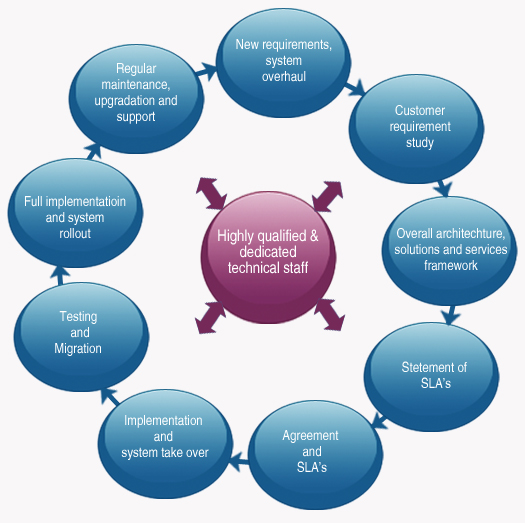We have developed a proven process for project implementations that minimize time to delivery, lower total cost of ownership for our clients and mitigate risk. Our unique project methodology below reflects the project execution strategy that we follow for complex technology engagements. Our approach is based on execution phases and enablement tracks which address the commercial, operational and change management aspects of a complex and mission critical technology implementation projects